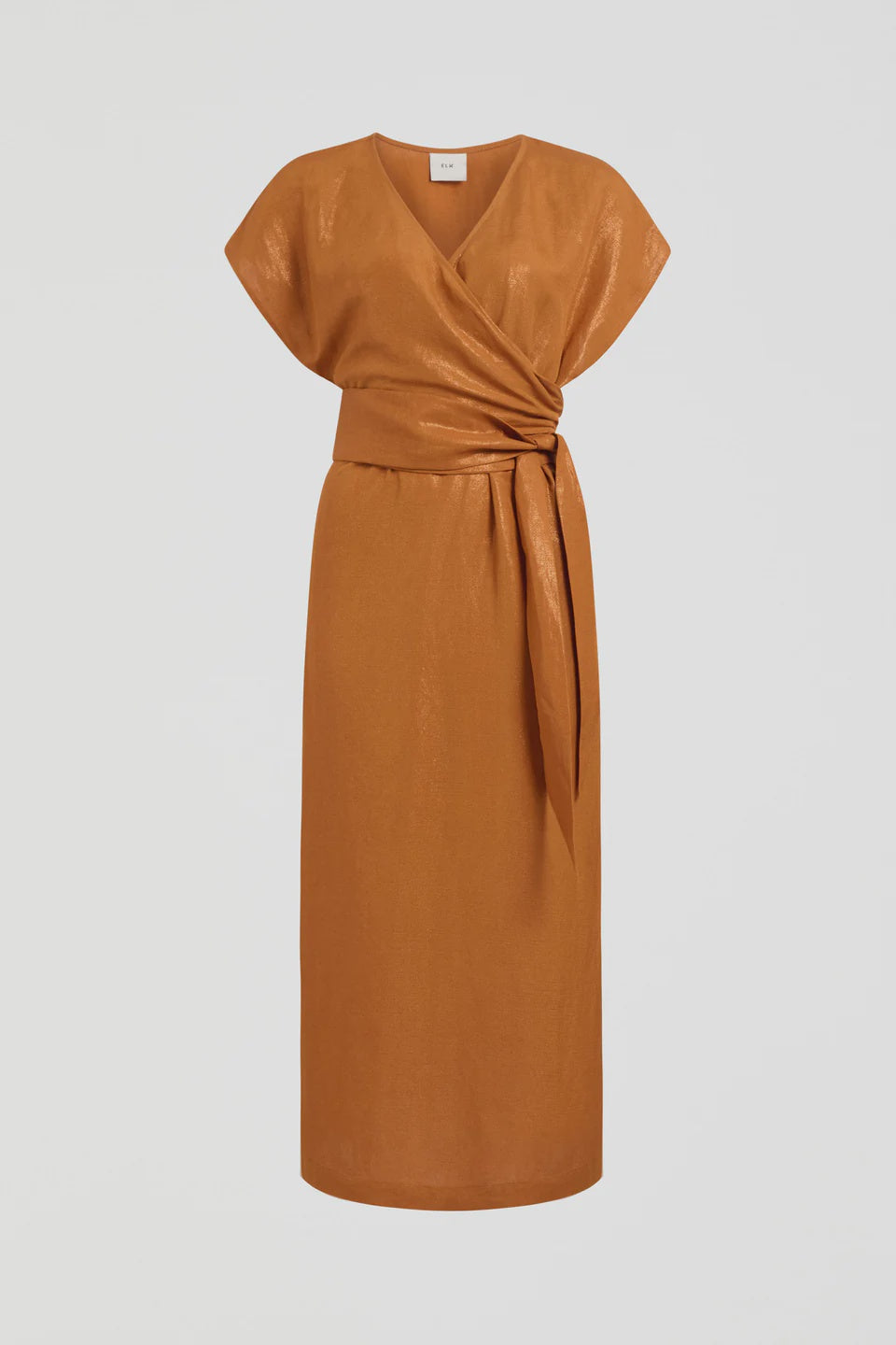 Make a statement in the Jopa Dress, designed in a rich copper base with a shimmery metallic foil finish that catches the light beautifully. Crafted from a soft French linen and viscose blend, this wrap-style dress drapes effortlessly while adding a touch of luxury to your wardrobe. With its V-neckline, short batwing sleeves, and wide wrap belt that can be tied in multiple ways, this is a piece you’ll reach for on both relaxed days and special evenings. Hem splits on both sides give ease of movement and a modern finish.
