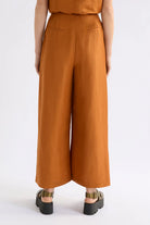 Elevate your everyday style with the Jopa Pant, designed with a flattering high-rise waist and wide-leg silhouette in a slightly cropped length. Crafted from a soft French linen and responsibly sourced viscose blend, these pants feel lightweight and breathable with a subtle texture and cool hand feel. A shimmery foil print brings a touch of luxury to the rich copper base, catching the light beautifully with every step.