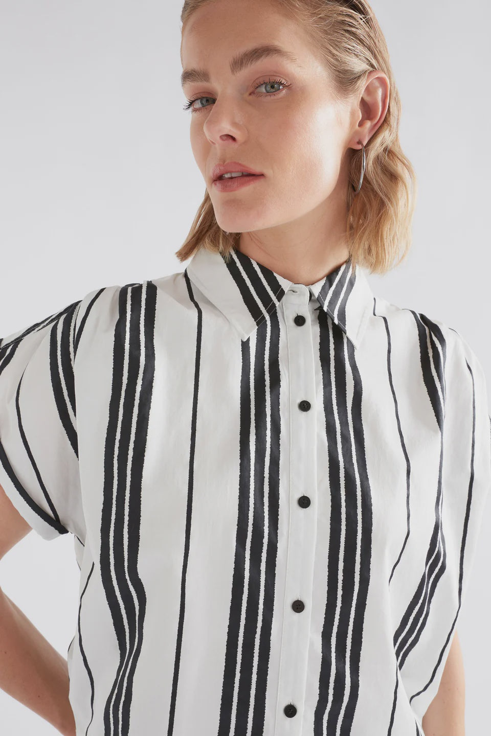 The Reza Shirt is a crisp, modern take on summer dressing. Crafted from 100% organic cotton with a smooth, structured finish, this slightly cropped shirt features a boxy regular fit and classic collar for timeless appeal. The straight hem at the front and elasticated hem at the back add subtle shape, while delicate gathers at the shoulder seam bring softness to the silhouette.