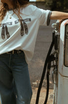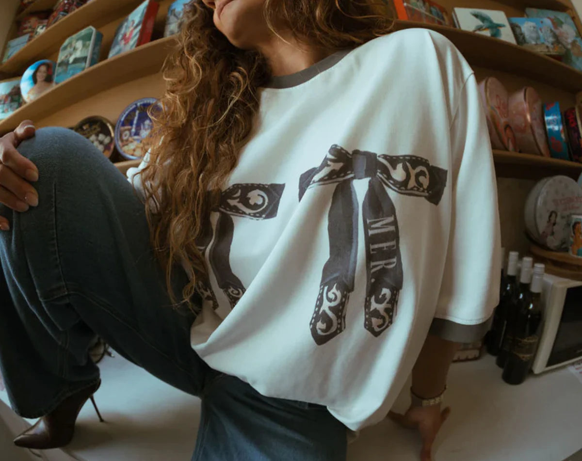 Playful meets cool in the Far Mer by Whitney Western Bow Tee — a statement piece featuring original artwork by Australian artist Whitney Spicer. With twin printed bandana-style bows across the chest and contrast detailing on the collar and sleeves, this tee turns a classic cut into something seriously special.