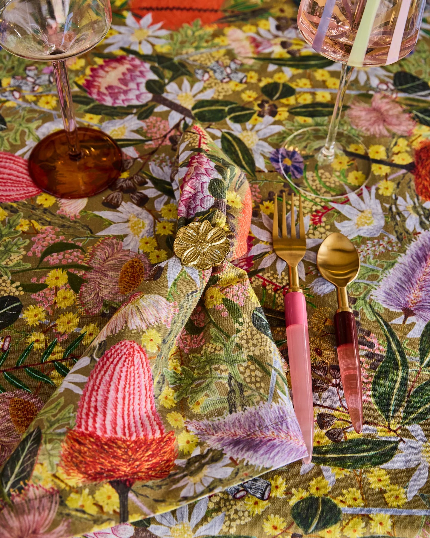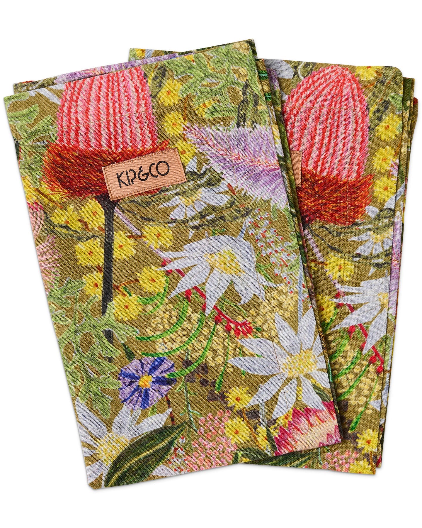 Featuring a collage of native Australian flora on an olive green base, this signature Kip&Co print brings a little slice of the bush to your table. Made from a luxe linen-cotton blend, they’re designed to look beautiful, feel effortless, and last for years to come — softening naturally with every wash.