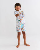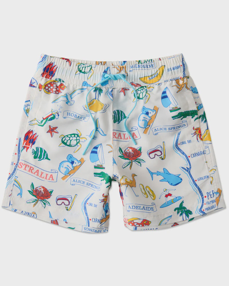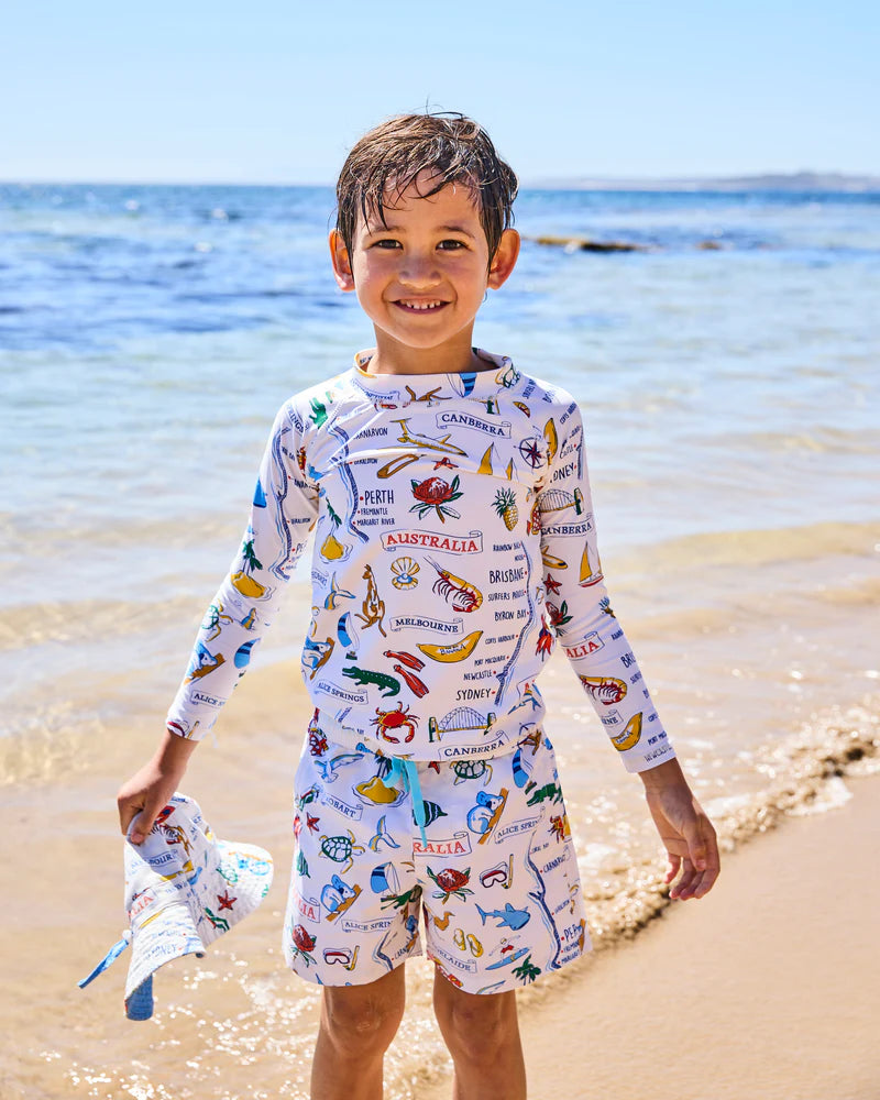 From backyard sprinklers to salty beach days, our Aussie Road Trip Boardies are ready for it all. Made with lightweight, quick-dry fabric from 100% recycled polyester, they’re built for endless summer play – swim, splash, dash, repeat! The print is pure joy: a colourful road trip across Australia, filled with iconic sights and fun details on a crisp white base, finished with a bright blue drawstring waist. Easy to wear, easy to wash, and destined to be pulled on day after day.