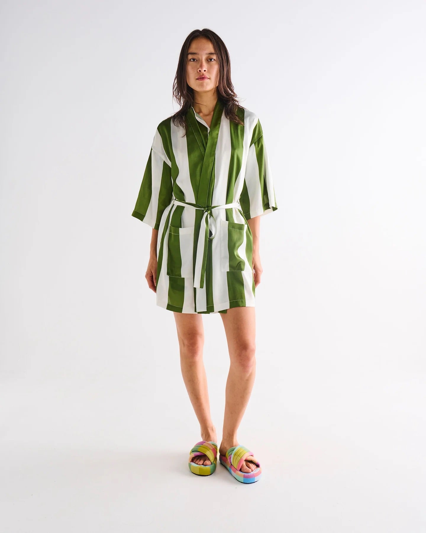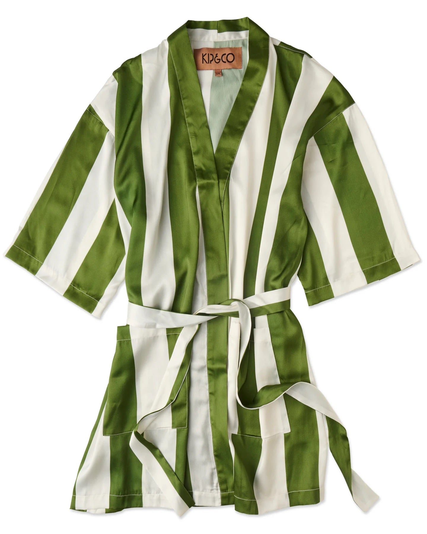 Slip into laid-back luxury with the Kip&Co Moss Stripe Eco Satin Robe. Crafted from eco-friendly recycled polyester satin, this robe feels silky smooth and oh-so-comfortable. The creamy white and moss green stripes add a fresh, timeless vibe – perfect for slow mornings, golden afternoons, or throwing on after a swim. Relaxed yet stylish, it’s your new everyday essential for lounging in Kip&Co’s signature playful luxe.
