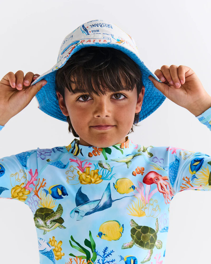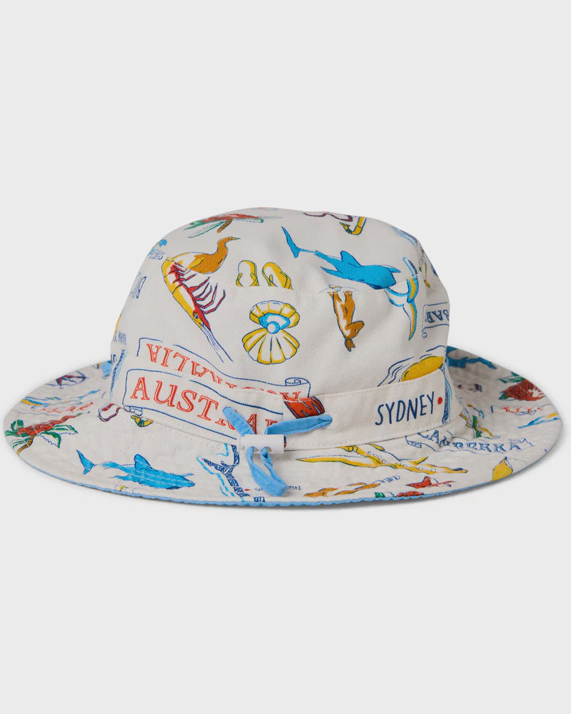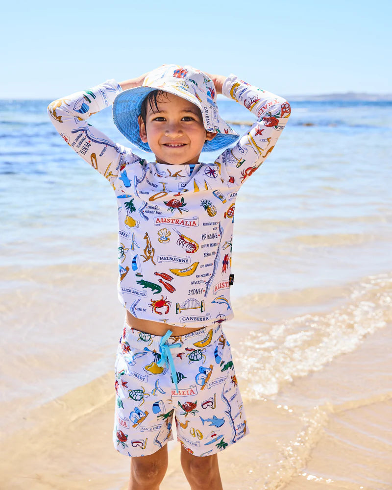Big days under the Aussie sun call for a hat that’s as fun as it is functional. Our Aussie Road Trip Beach Hat is made from 100% cotton drill and splashed with a print full of iconic sights and summer favourites. Lightweight, comfy, and finished with an adjustable chin strap and quick-release buckle, it’s designed to stay put while kids run, dig, splash, and play their way through the holidays. A summer staple for little explorers who never sit still.
