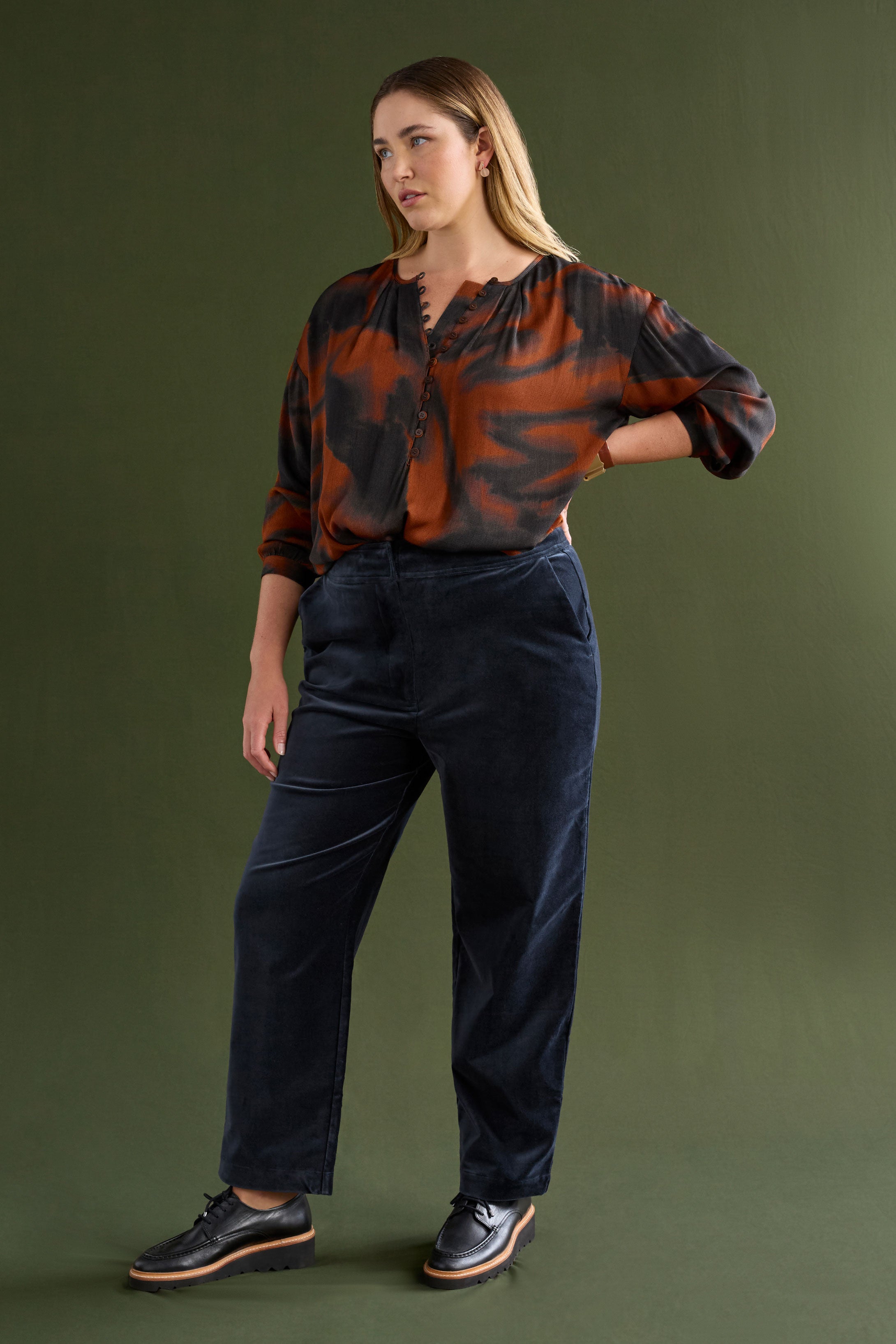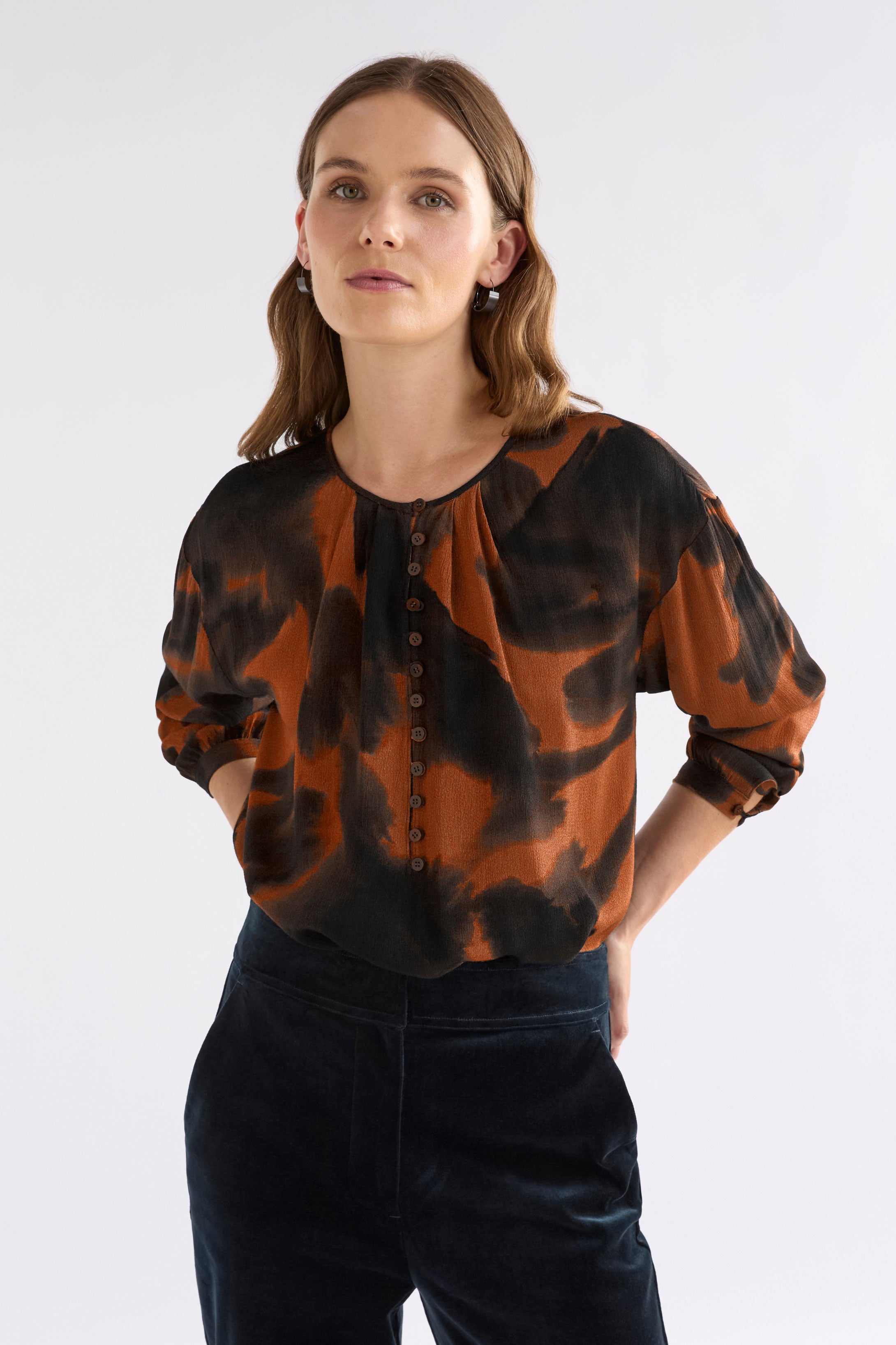Make a statement from desk to dinner in the Galerie Shirt – a bold yet effortless piece in our watercolour-inspired Tortoise Shell print. Crafted from textured crepe in rich burnt orange tones, this relaxed-fit blouse features soft pleats at the neckline and back, adding fluidity and movement through the body.