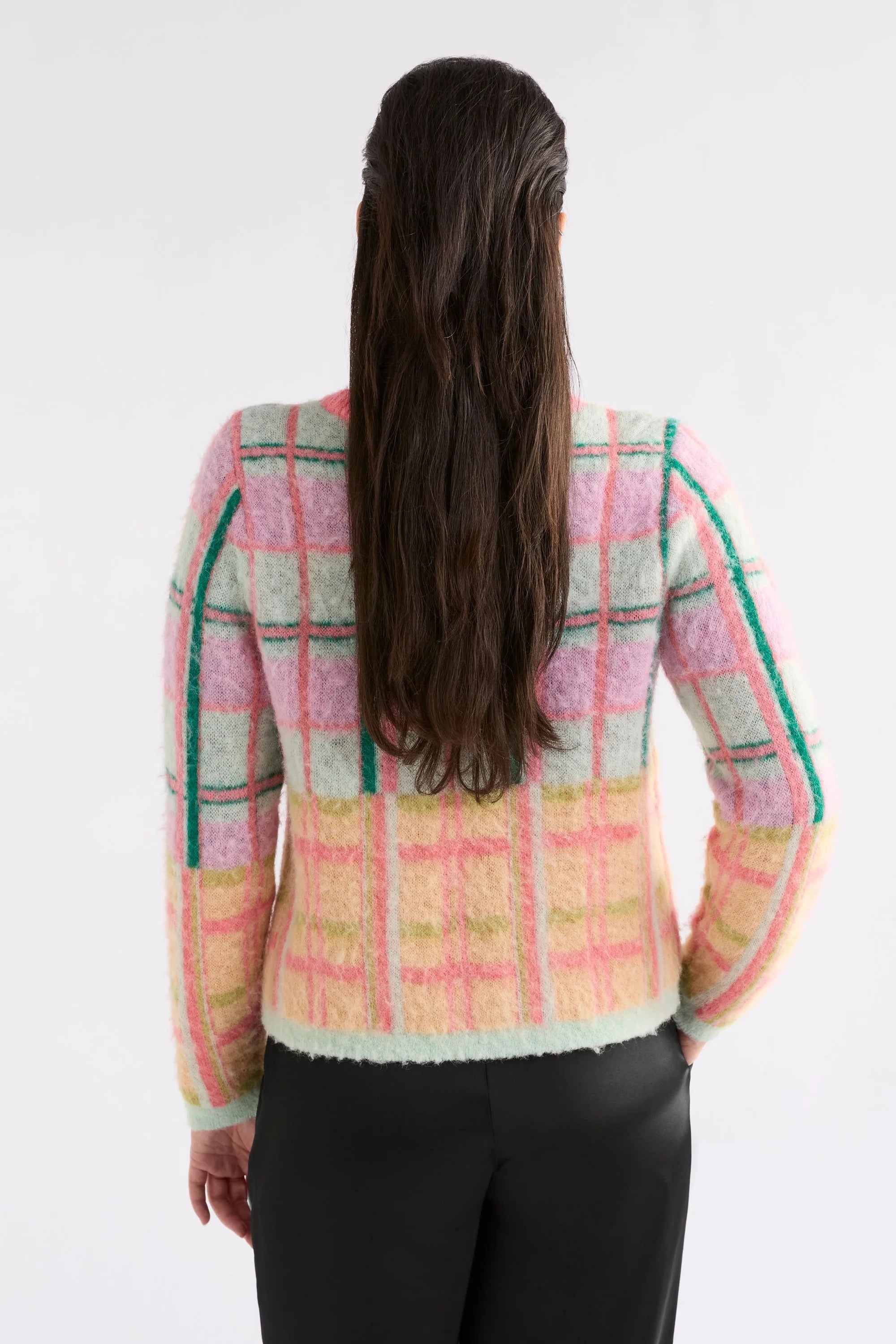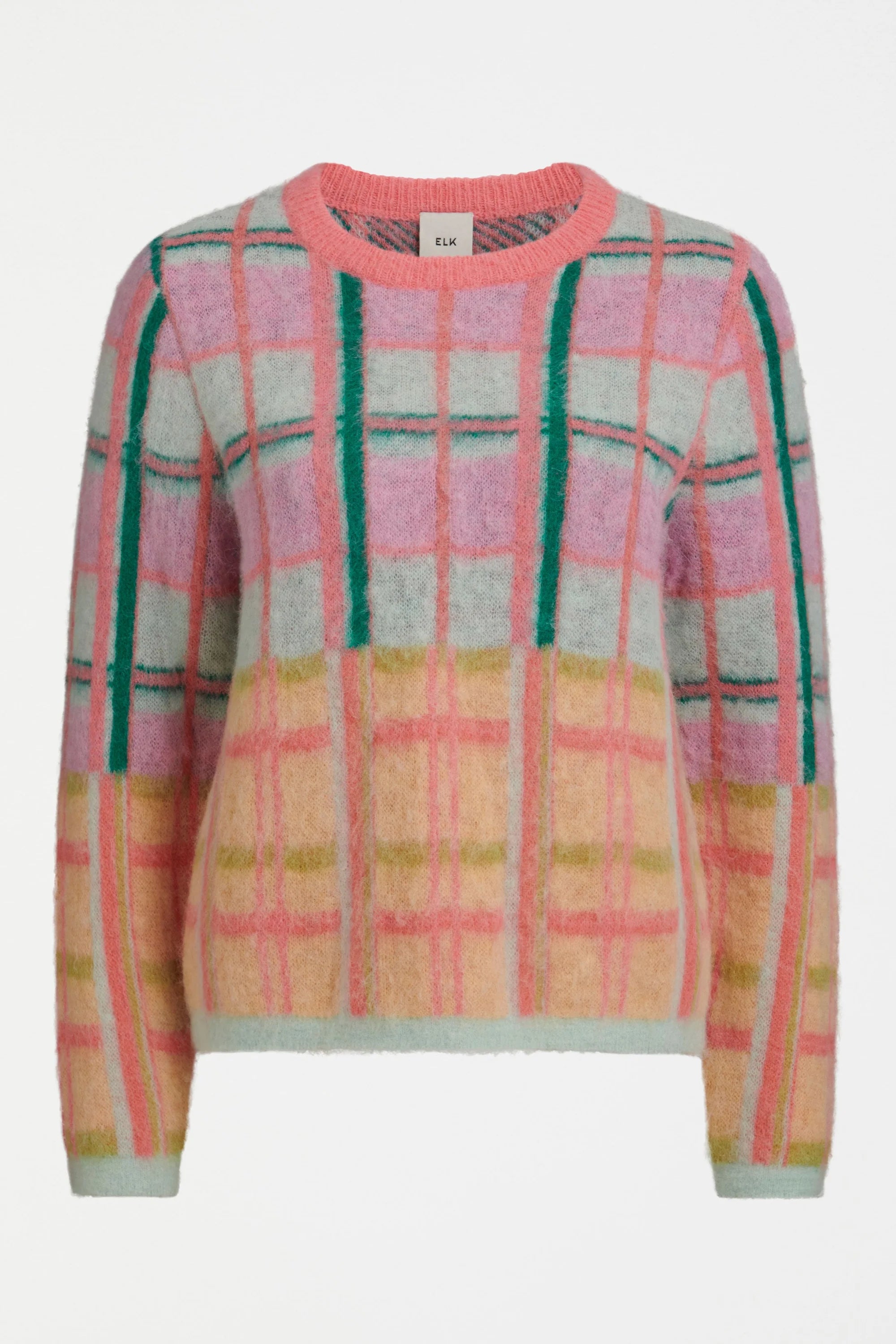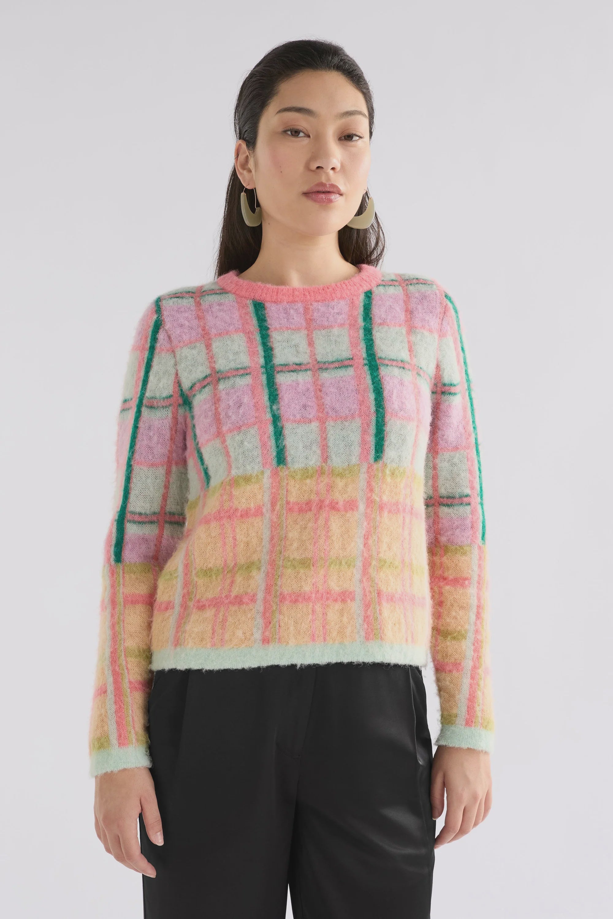 This bold beauty is a winter standout. The Ostti Sweater brings serious colour and softness to your wardrobe, with a vibrant jacquard check in pink, green and orange — guaranteed to lift any outfit.