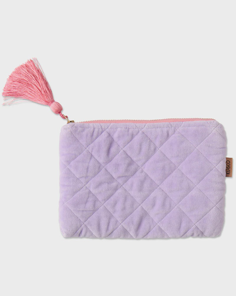 Quilted velvet cosmetics purse with zip closure and feature tassel.